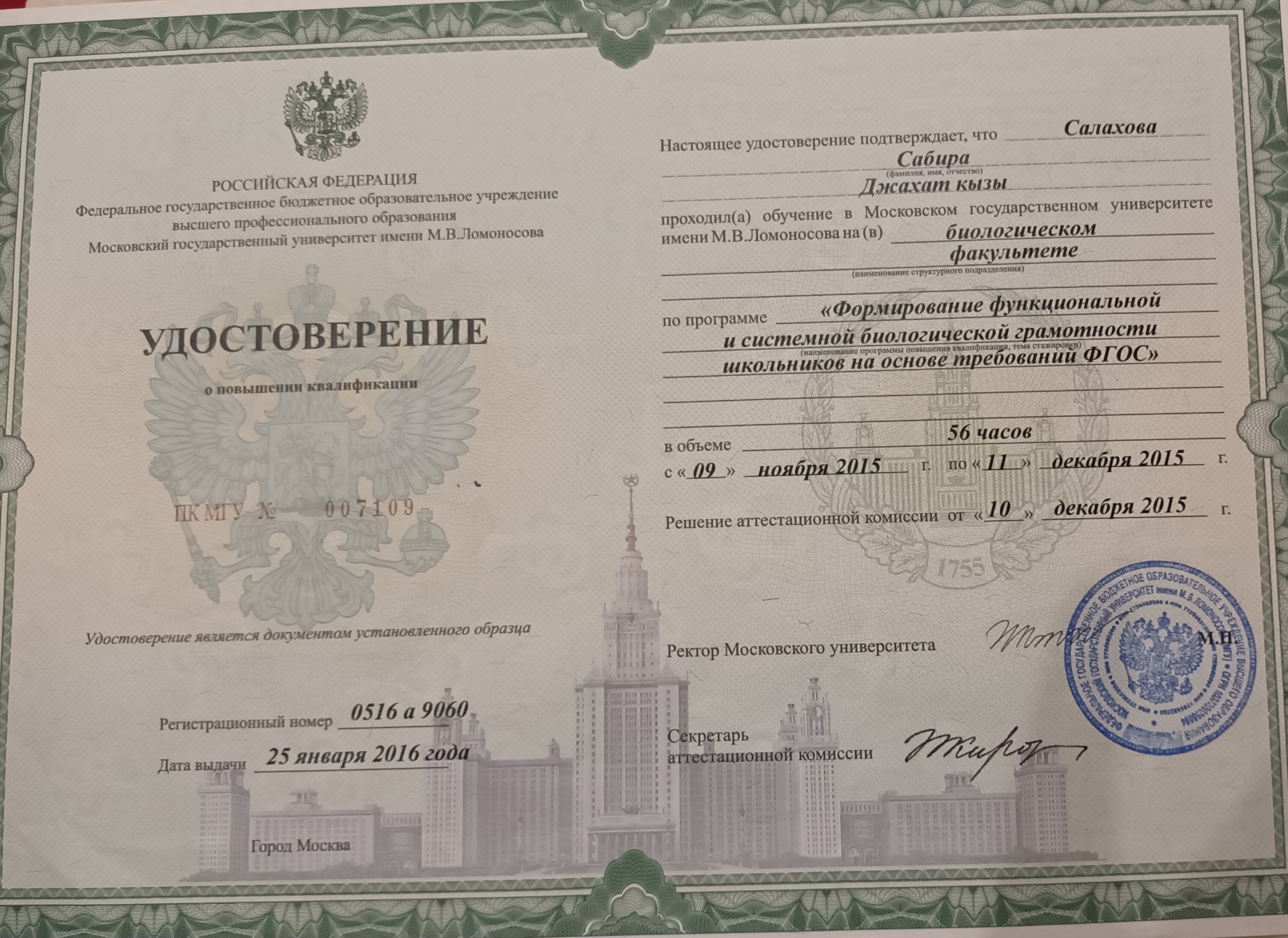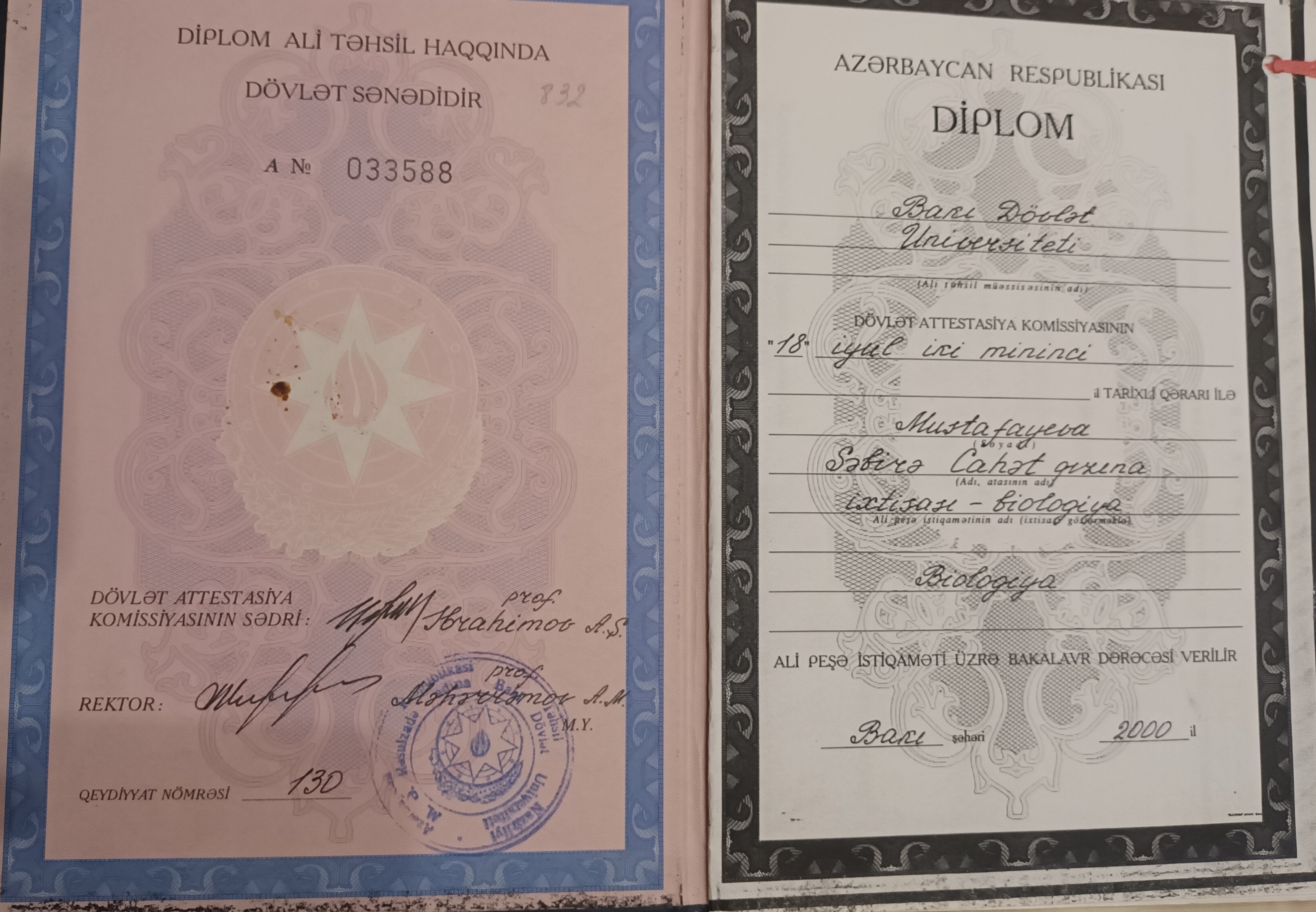 Закончила БГУ, факультет биологии (в Баку) прошла обучение в МГУ(в Москве) и в Лондоне. Работала в ГБОУ Школе 117.