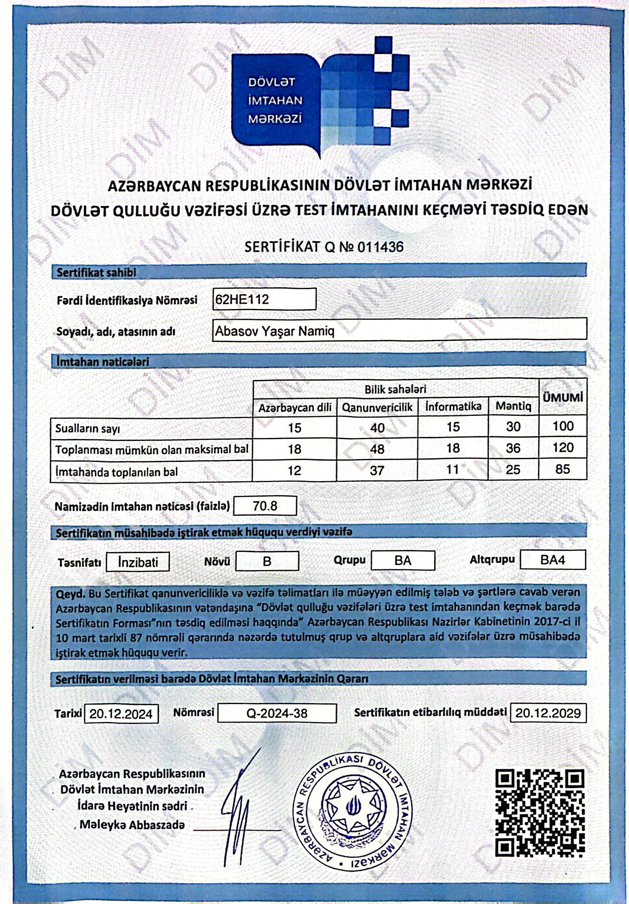 Mən, Abasov Yaşar Namiq oğlu 09.07.1997-ci il tarixində Cəlilabad rayonu Günəşli kəndində anadan olmuşam. Hal-hazırda Bakı şəhərində yaşayıram. Tam ali təhsilliyəm. 2014-2018-ci il tarixlərdə Lənkəran Dövlət Universitetinin “İqtisadiyyat” ixtisası üzrə bakalavr ali peşə-ixtisas, 2018-2020-ci il tarixlərdə isə “Akademik heyətin təşkilata bağlılıq səviyyəsinin ölçülməsi” mövzusunda dissertasiya işimi müdafiə edərək, Bakı Mühəndislik Universitetinin “Sənaye üzrə istehsalat və xidmət sahələrinin iqtisadiyyatı və idarə edilməsi” ixtisası üzrə magistr elmi-ixtisas dərəcəsinə yiyələnmişəm. 2024-cü ilin Dekabr ayında DİM tərəfindən Dövlət Qulluğu vəzifəsi üzrə keçirilən müsabiqənin test mərhələsində iştirak edərək, BA4 altqrupu üzrə sertifikata yiyələnmişəm. 2020–2021-ci il tarixlərdə DSX-nin 2023 №-li hərbi hissəsində həqiqi hərbi xidmət keçmişəm. Təhsil aldığım müddət ərzində internet resurslarından istifadə edərək, əmək bazarında tələb olunan əsas kriteriyalar və aidiyyəti sahələr üzrə müstəqil şəkildə özümü müəyyən qədər təkmilləşdirməyə nail olmuşam və hal-hazırda da təkmilləşmə mərhələsindəyəm.