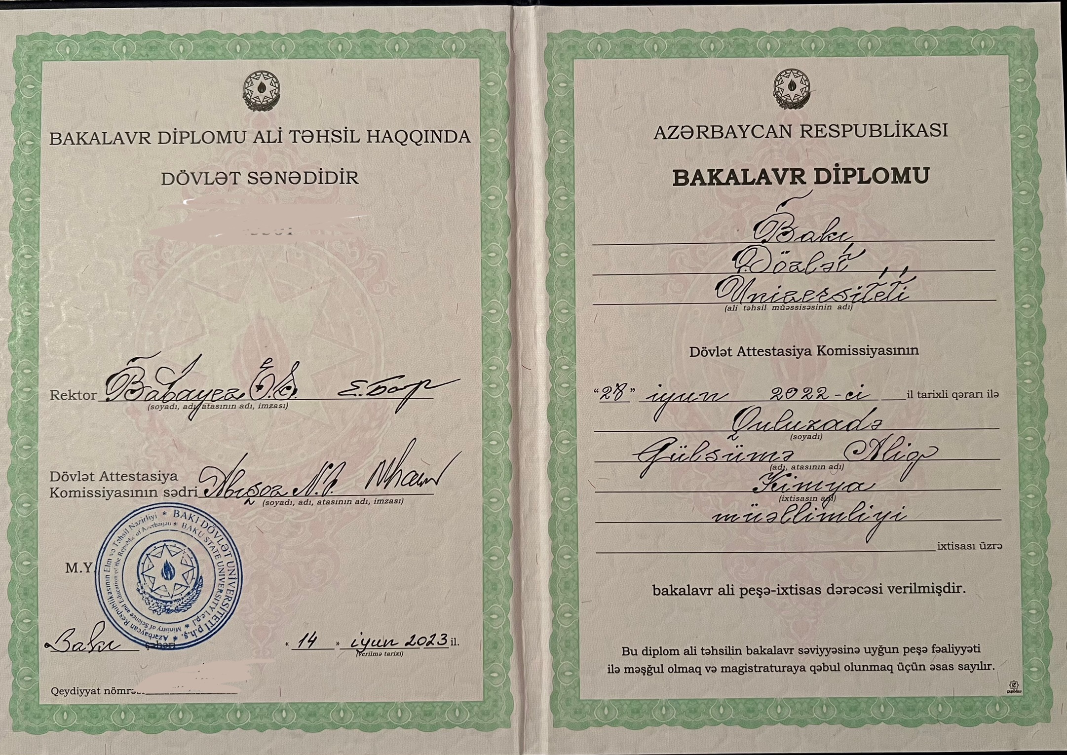 2022-ci ildə Bakı Dövlət Universitetinin Kimya müəllimliyi ixtisasını bitirmişəm. Həmin ildən etibarən Beyləqan rayonunda kimya müəllimi kimi fəaliyyət göstərir və eyni zamanda fərdi şəkildə repetitorluqla məşğul oluram.