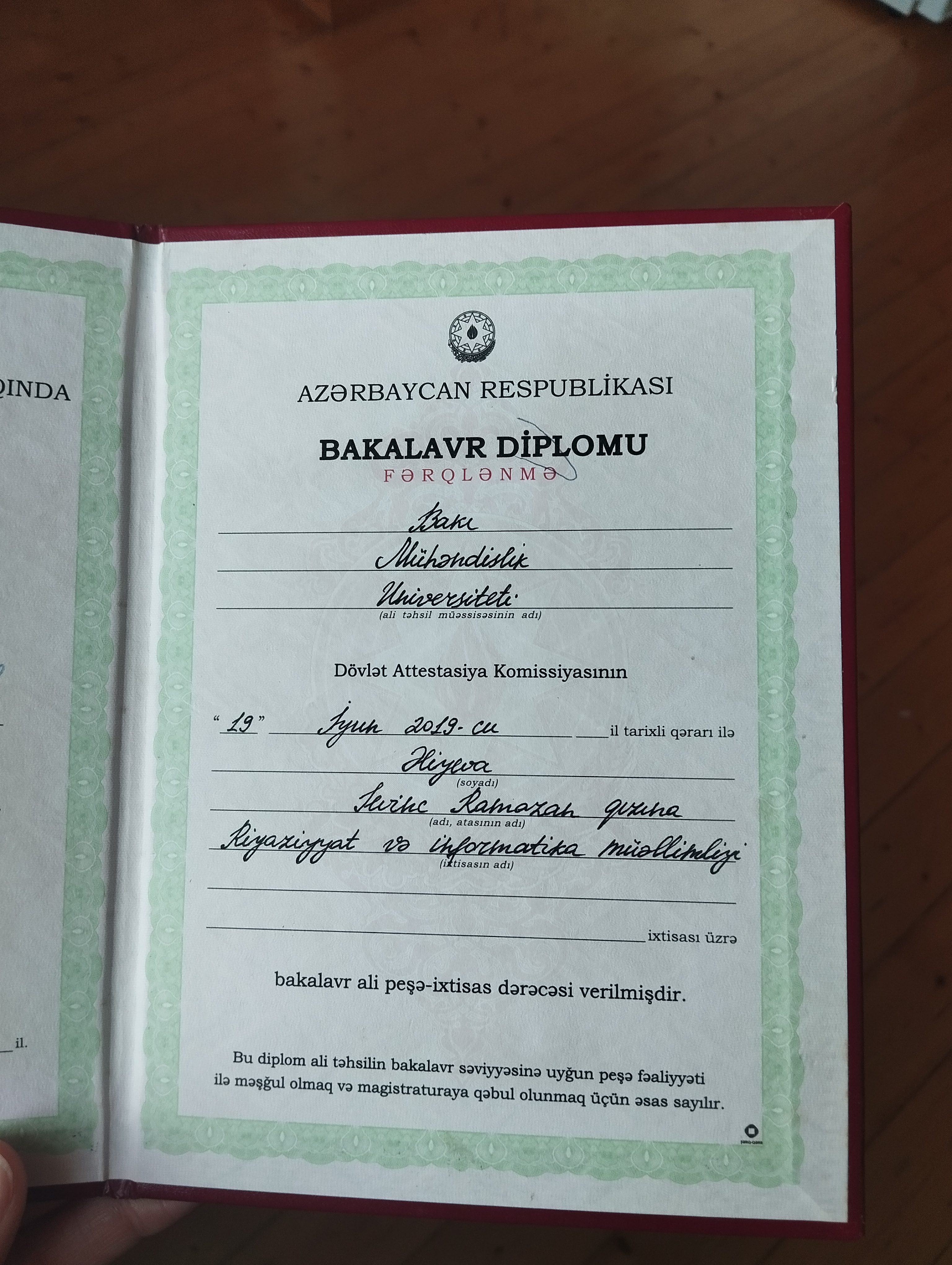 Bakı Mühendislik Universitetinin Riyaziyyat ve İnformatika müellimliyi ixtisasını tədris dili ingilis dili olaraq ferqlenme diplomu ile bitirmişem.Mesuliyyetli,peşekar ve telebkar yanaşıram hər bir şagirdə qarşı.Akademik bacarıqlarıma ve savadıma güvenirem.